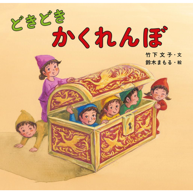 みんなあつまれ!ぜんぶで6にん。 なにして遊ぶ? かくれんぼしよう! 鬼を決めるよ、じゃんけんぽん、あいこでしょ! あおくんが鬼だよ。いーち、にー、さーん――じゅう! もういいかい? まーだだよ。――もういいかい? もういいよ! みんなどこに隠れたかな? どきどき かくれんぼ。赤いいちごの中に、赤い帽子のあっちゃん、みーつけた! くまさんのかげに、みどくん! ちゃーくんはつみきの下。ももちゃんはお花の中。あれ? きいちゃんがいない!