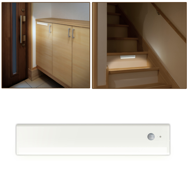 ●超薄型充電式センサーライトシリーズ。人が近づくとふわっと自動点灯。モード切替で常時点灯も可能です。さっと外して懐中電灯に。