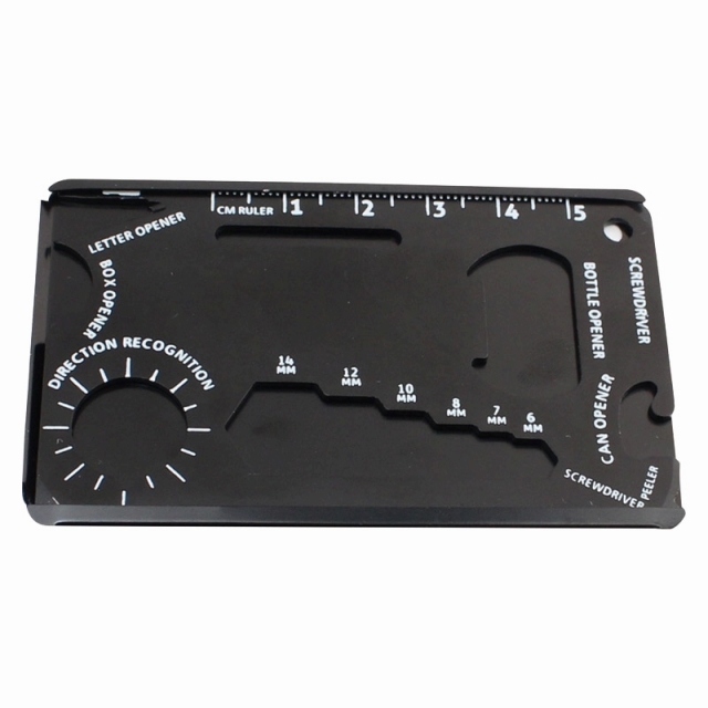 ■内容:本体(約85×55×2mm)、ボックスオープナー・レターオープナー・ルーラー(5mm)・蝶ねじレンチ・栓抜き・キーチェーンホール・ドライバー(4種類)・缶切り・フルーツピーラー・六角レンチ(6サイズ)・角度ゲージ・ストラップ×各1■材質:ステンレス・アルミニウム■重量:約41g■原産国:中国製