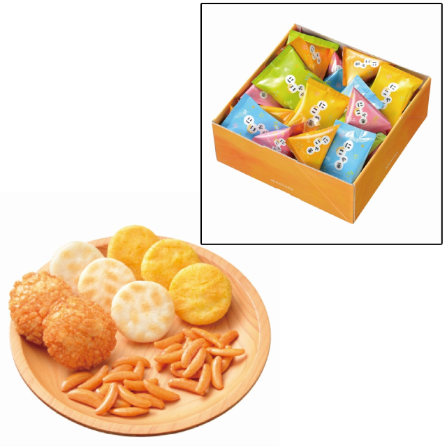 ■内容:亀田の柿の種(5g/個装)・梅しそ柿の種(5g/個装)・しおせんべい(1枚)・カレーせんべい(1枚)・あげせんべい(1枚)×各6■重量:約264g■アレルゲン:卵、小麦