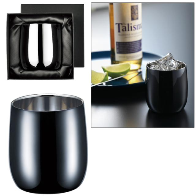 18-8ステンレスを酸化被膜により黒く染めた後、職人が一つ一つ丁寧に磨き込むことで、黒い輝きを放ちます。2重構造で、温かさ・冷たさが長持ちします。