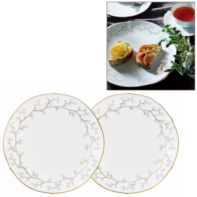 幸福や感謝を意味するかすみ草を花冠のモチーフに。白とブルーで表現した爽やかな花を電子レンジ対応のゴールド装飾が引き立てます。