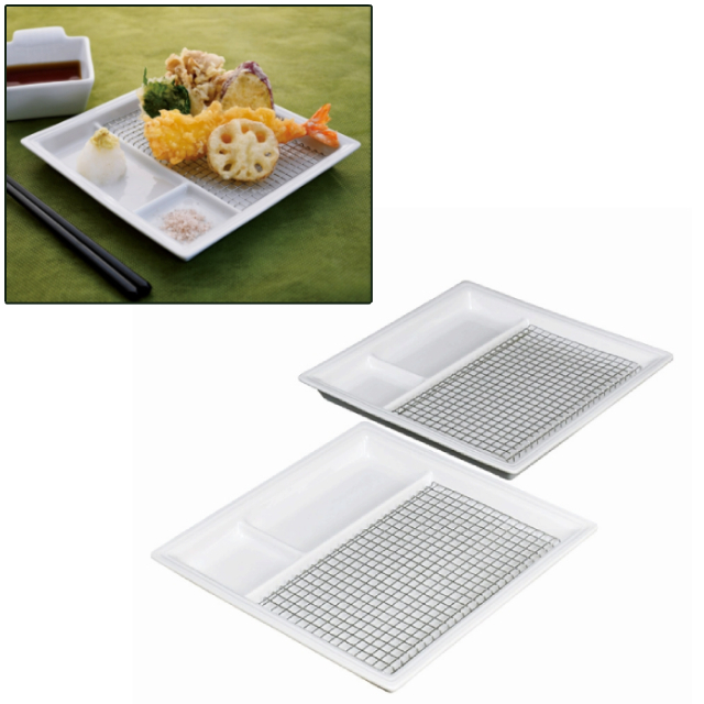 シンプルな美しさと機能性を兼ね備えた、ちょっと小さな四角い仕切り皿です。揚げ物の油切りや、麺類などの水切りとしても使えるステンレス製の網付。