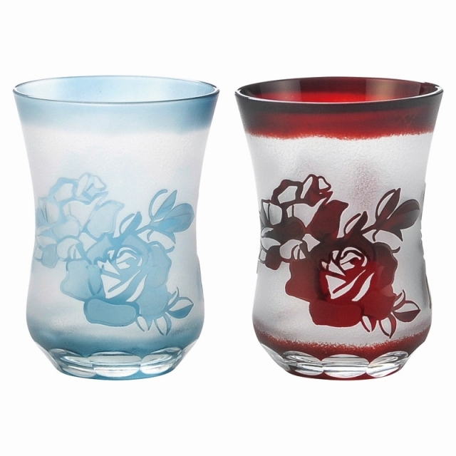バラの柄が印象的な青と赤の切子です。
