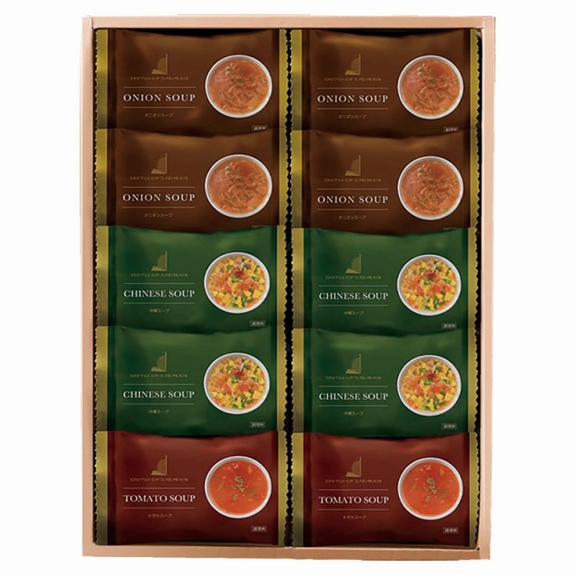 ■内容:中華スープ・オニオンスープ×各4、トマトスープ×2■重量:約330g■アレルゲン:卵、乳、小麦