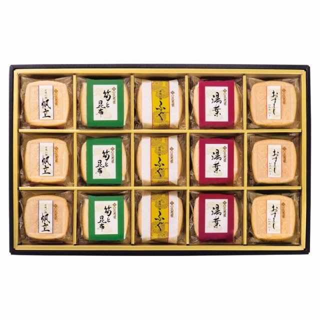 ■内容:帆立(12g)・筍と昆布(12g)・ふぐ(12g)・湯葉(12g)・おすまし(12g)×各3■重量:約620g■アレルゲン:小麦