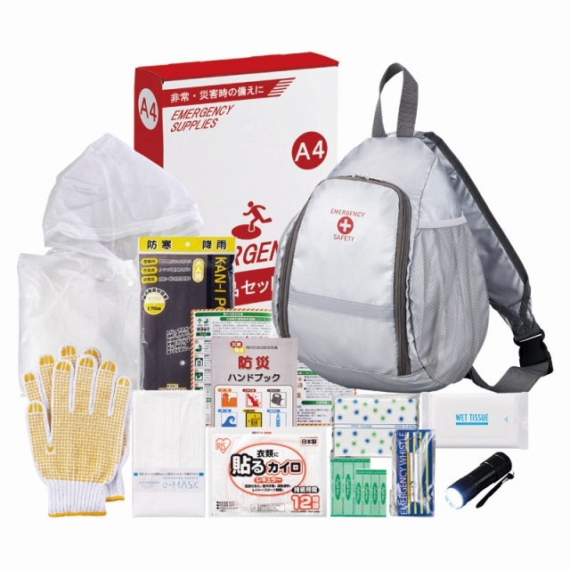 地震発生直後から避難場所へプラス帰宅支援までを視野に入れたワンショルダー避難セット。