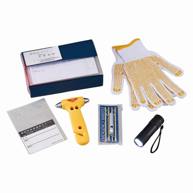 ■内容:収納ケース(約122×185×50mm)×1、ホイッスル・9光ライト・軍手・脱出ハンマー・車両所有者確認ラベル(シール付き袋入り)×各1■材質:PVC■重量:約365g■単4×3(別売)■原産国:日本・中国製
