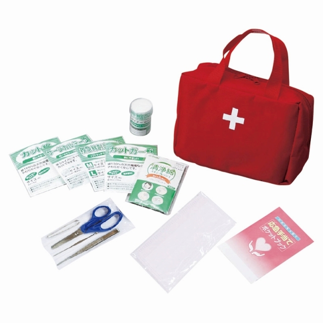 ■内容:救急バッグ(約230×100×155mm)×1、カット綿(3枚)・カットガーゼ(3枚)・包帯・救急絆創膏(2サイズ×3枚)・サージカルテープ・清浄綿(2枚入×3包)・ハサミ・ピンセット・毛抜き・耳かき・マスク・応急手当てポケットブック×各1■材質:ポリエステル■重量:約408g■原産国:中国・日本・インドネシア製