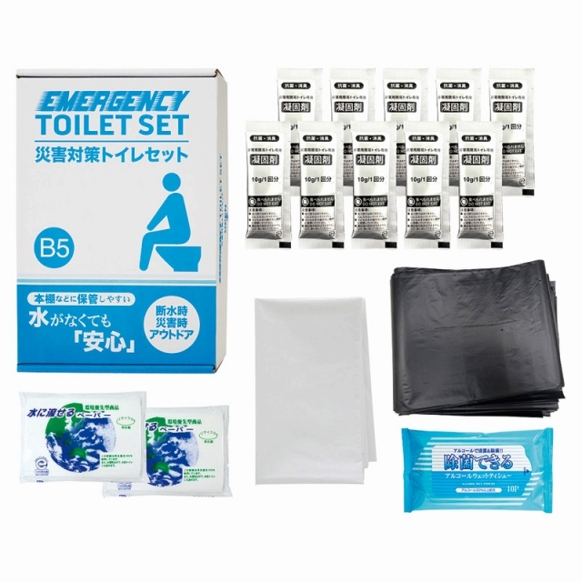 コンパクトに備蓄可能なトイレ処理キット。B5ファイルボックスサイズで棚や引き出しに常備しやすい。断水時にも便座に袋をセットし、使用後に凝固剤を振りかけるだけで排泄物の処理が可能。可燃ごみとして廃棄できます。
