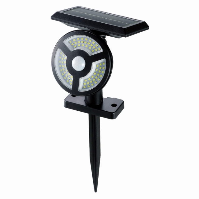 人を感知してライトがつくソーラー充電式防犯ライト。壁にも取り付け可能。●電源:光電池●防水性能/IPX54相当