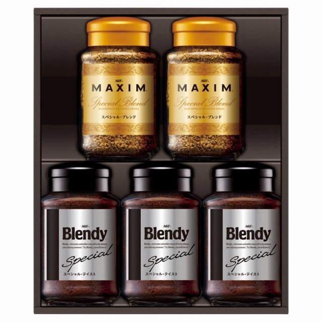 まずはストレートで楽しみたい「マキシム」と、ミルクをたっぷり入れて深いコクのカフェオレが楽しめる「ブレンディ」をセットにした、インスタントコーヒーのバラエティギフトです。