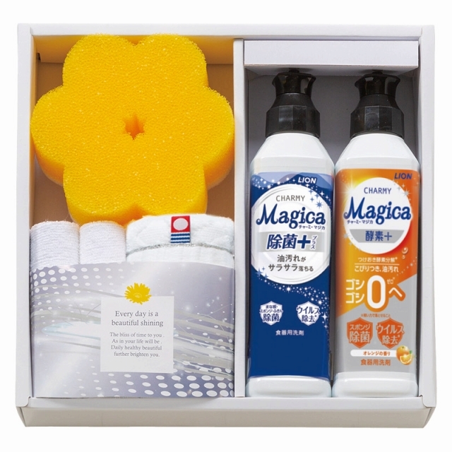 ナノ洗浄で油汚れもサラサラ。食器洗いが手早く片付く、食器用洗剤ギフト。ナノ洗浄でベタつく油汚れもサラサラ落とす食器用洗剤チャーミーマジカと今治タオルやマイクロファイバークロスがセットになった、役立つキッチン洗剤ギフトです。