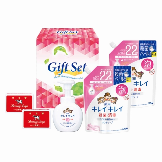 きちんと殺菌しバイ菌から手肌を守るライオンキレイキレイ泡ハンドソープと牛乳石鹸のギフトセット。