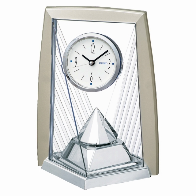 薄金色のフレームの中に時計が浮いているような、シルバーの多角錐形回転飾りを配した近未来的なモデル。○クオーツ時計 ○スイープ秒針 ○一方向回転飾り