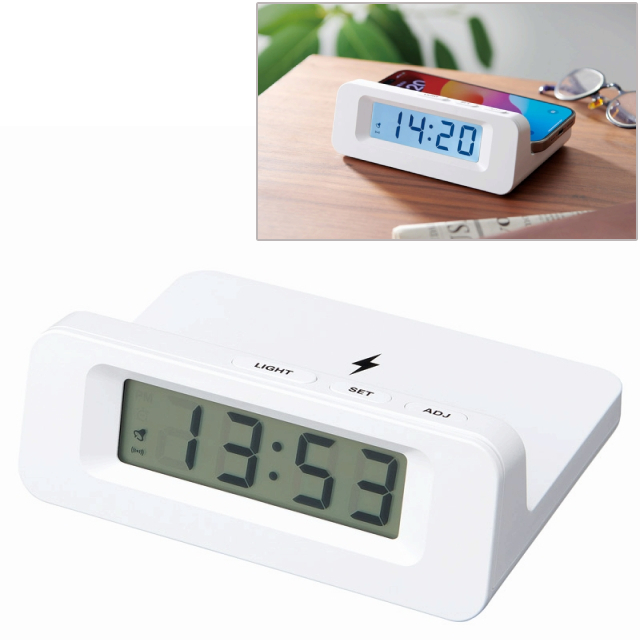 qi対応のスマートフォンを置くだけで充電できるワイヤレス充電機能付のデジタルクロックです。○ワイヤレス充電○時計○アラーム○スヌーズ○日付○時報○バックライト