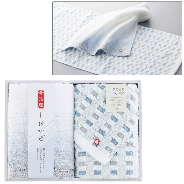 その名の通り、瀬戸内を吹き抜けるしおかぜのような、涼やかなデザインの今治タオルギフトです。