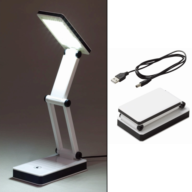 コンパクトに折りたたみ可能なLED電気スタンドです。乾電池とUSB電源いずれでも使用可能なので、外出先でも便利です。(3段階調光機能付)