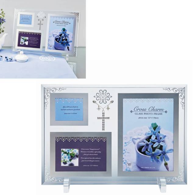 クリアガラスに、クロスチャームの左右には小さなクローバーもついて、モダンなフォトフレームです。クロスは天と地の交流の象徴であり、生きる力の象徴ともされています。卓上用。フレームの周りはミラーになっています。