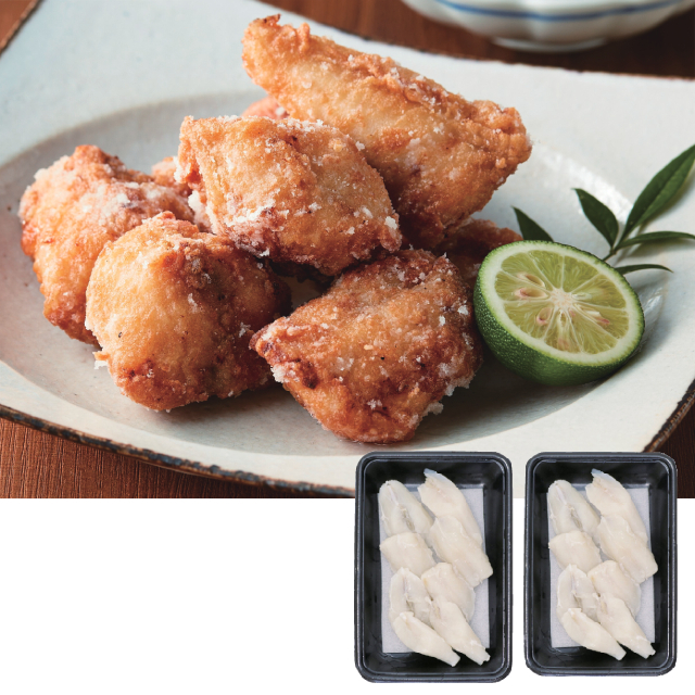 しろさばふぐをぶつ切りにし、ちり鍋用や唐揚げでも楽しめる切身に仕立てました。お好みの野菜と煮込めばふぐちり鍋として、また唐揚げ粉をまぶし、ご家庭で揚げていただければ簡単にふぐ唐揚げをお楽しみいただけます。
