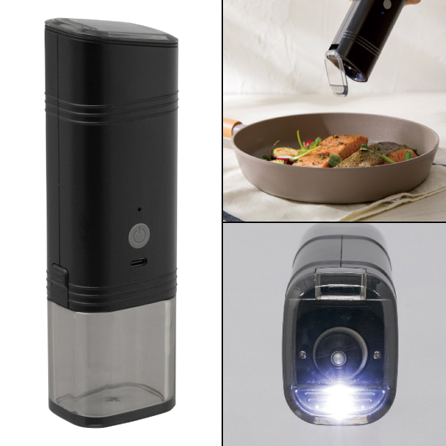 操作は傾けるだけ。誰でも簡単にソルトやペーパーを挽くことができる。調味料コンテナ100ml。粗々調整もできます。LEDライト付き