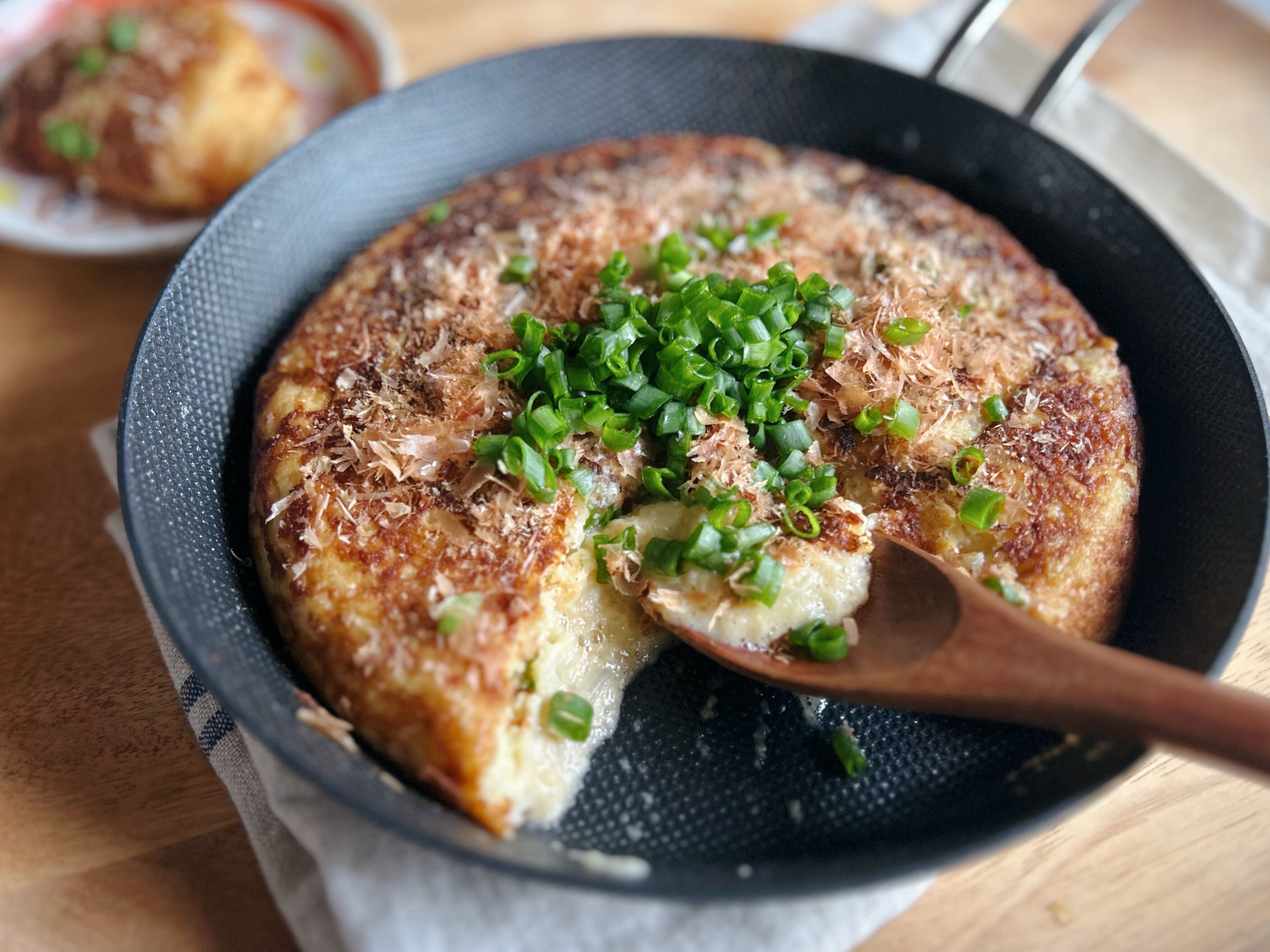 刻んだ青ねぎやかつお節を散らし、お好みで酢醤油やお好み焼きソースをかけても◎